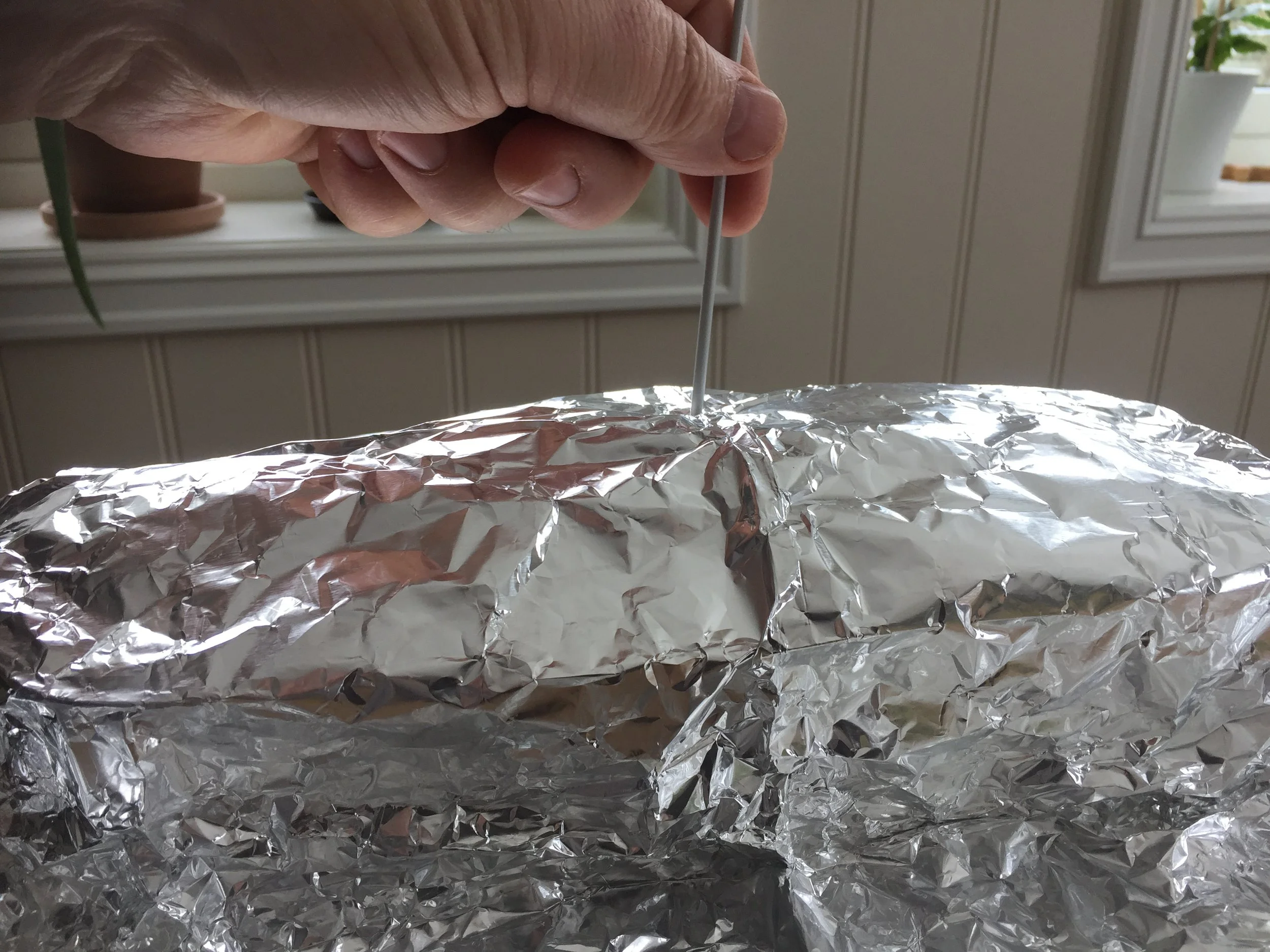 Dekk til med aluminiumsfolie, så fuktigheten holdes inne og dampingen av jorda blir god. Bruk en strikkepinne for å sjekke om poteten er kokt. Beregn ca 200 C i 1 time.
